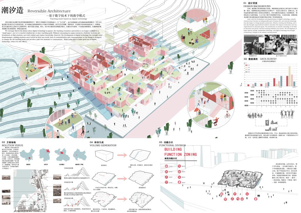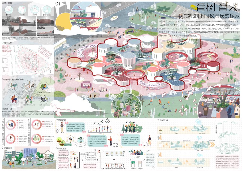 参赛学生陈建妃和陈文丽的作品“潮汐造”获得一等奖,作品设想在未来数字技术发展成熟的条件下,改变现代大学的教学模式,提供了一种基于数字技术下的教学模式,学生通过数字技术自行学习任何内容,在不消耗过多资源的情况下开拓学生视野,为学生提供一个沟通交流的场所。三等奖作品“育树·育人从“forest”这款办公软件中汲取灵感,将育树与育人结合,力求探索未来大学的新模式,在为学生创造学习空间的同时,栽培树木,填补校园景观空白。(撰稿/王照晰)
