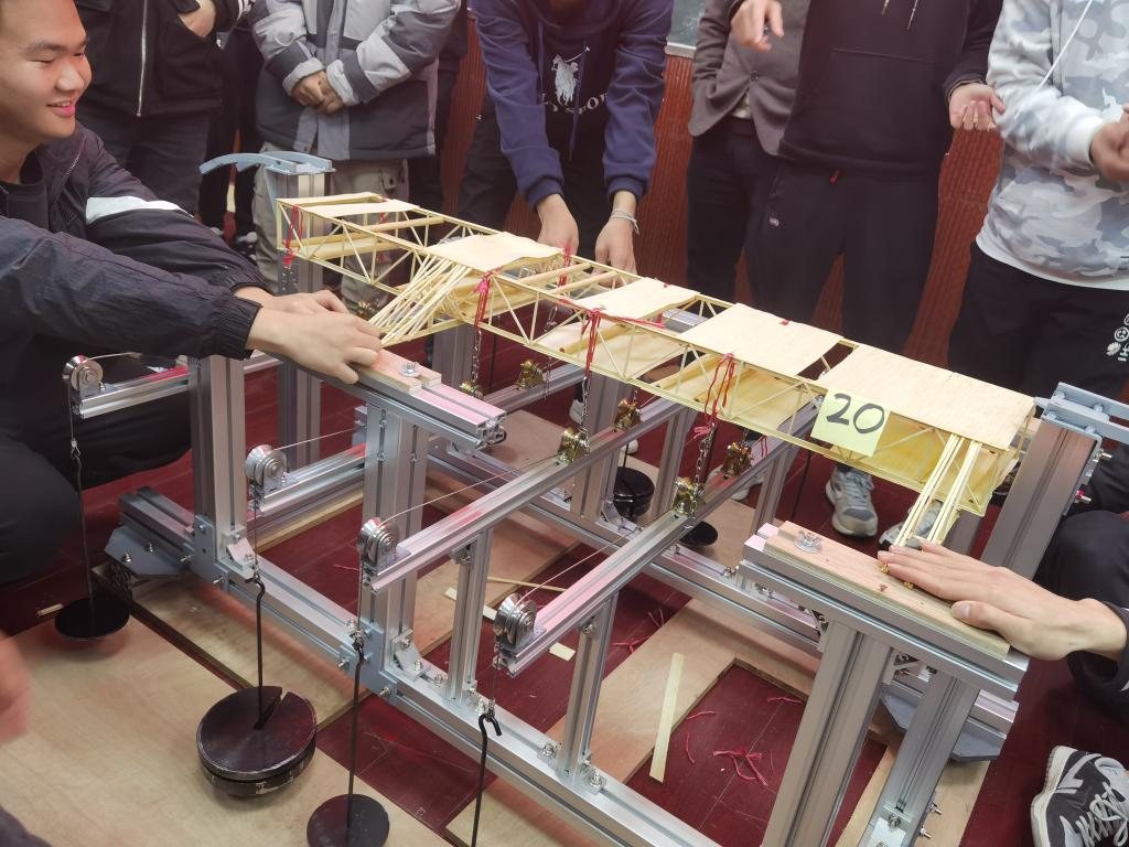 本次竞赛以“桥梁结构设计与制作”为题,要求学生2-3人一组,要求设计制作一座桥梁,承受分散作用的竖向集中静荷载以及局部转移荷载。在确保模型安全的前提下,还需要对模型的变形进行控制。采用竹制材料制作,具体结构型式不限。竞赛成绩按模型质量分、载荷分以及外观分以加权平均数进行计算,相同载荷分数下,模型质量轻者胜出。