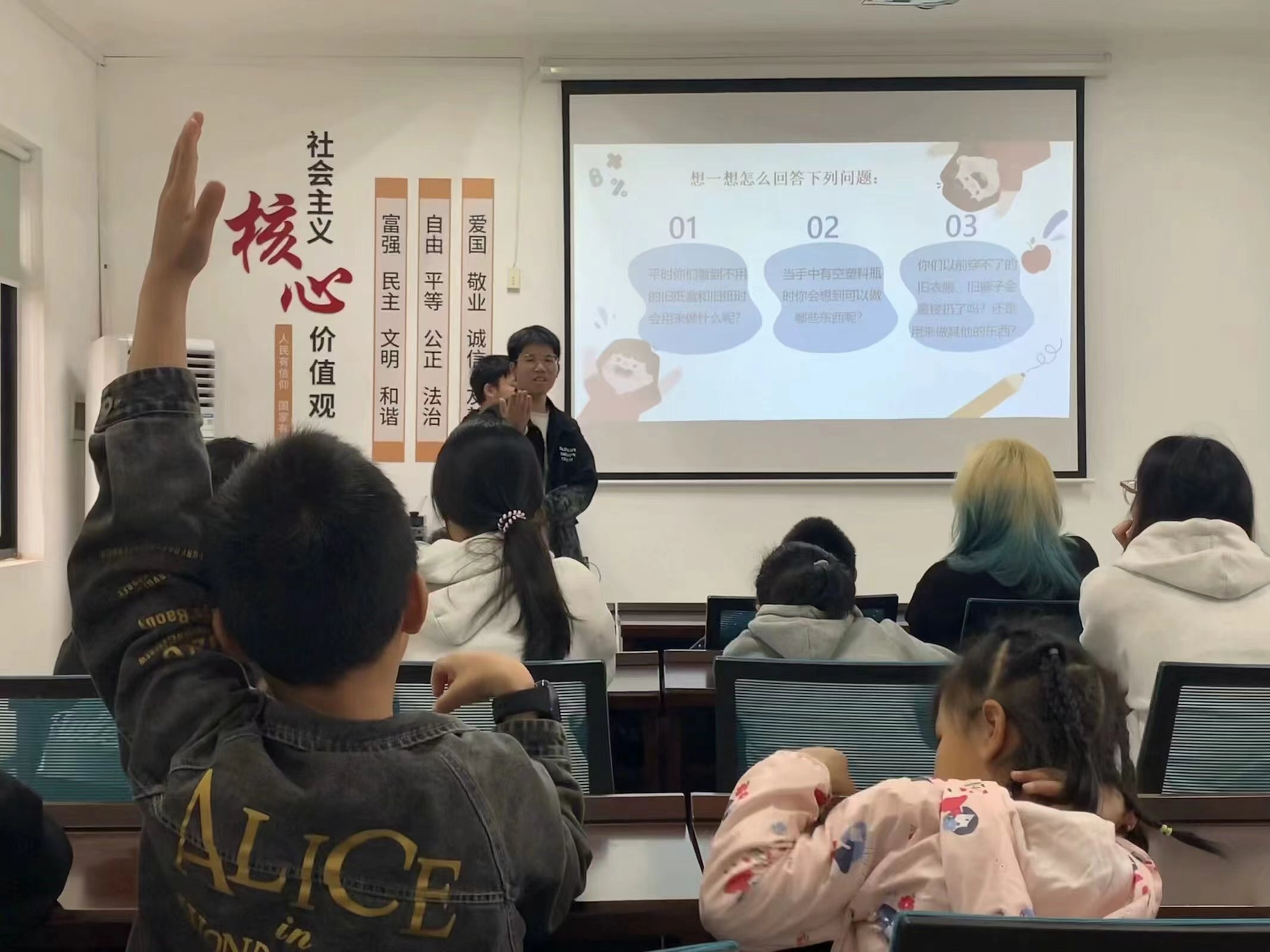 活动现场,志愿团队成员采用生动有趣的互动问答方式,向社区的小朋友们传授了关于变废为宝的环保知识,并重点介绍了日常生活中的环保小知识。随后,志愿者邀请小朋友们亲自动手,利用一次性筷子、瓶盖等废弃材料进行手工艺品制作。通过实际动手操作,小朋友们更深入地理解了“废物利用,变废为宝”的理念。