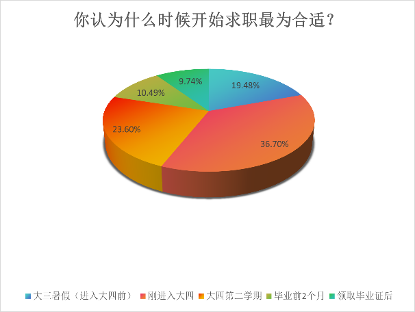 36.7%的同学认为最好的求职时间是刚进入大四这段时间,23.6%的同学认为大四第二学期是最好的求职时期,19.48%的同学认为大三暑假(进入大四前)是最好的求职时期