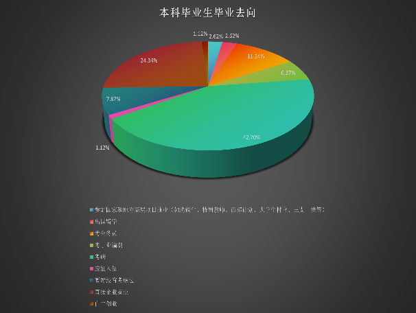 我院有114位应届毕业生准备考研,占比42.70%,65位学生选择直接进入企业就业,占比24.34%。