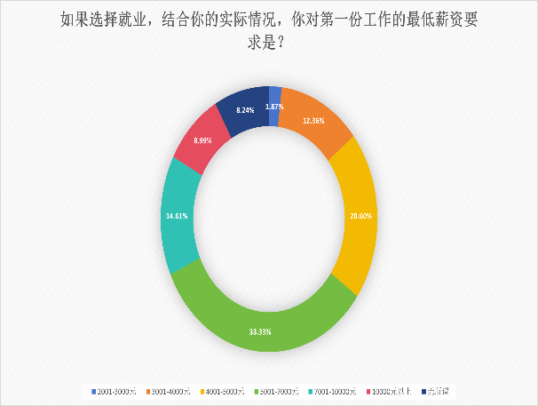 面对第一份工作的薪资期望值,2025届毕业生期待薪资为5001-7000的最多,占比33.33%,其次是4001-5000,占比20.60%,14.61%的毕业生期待7001-10000元。
