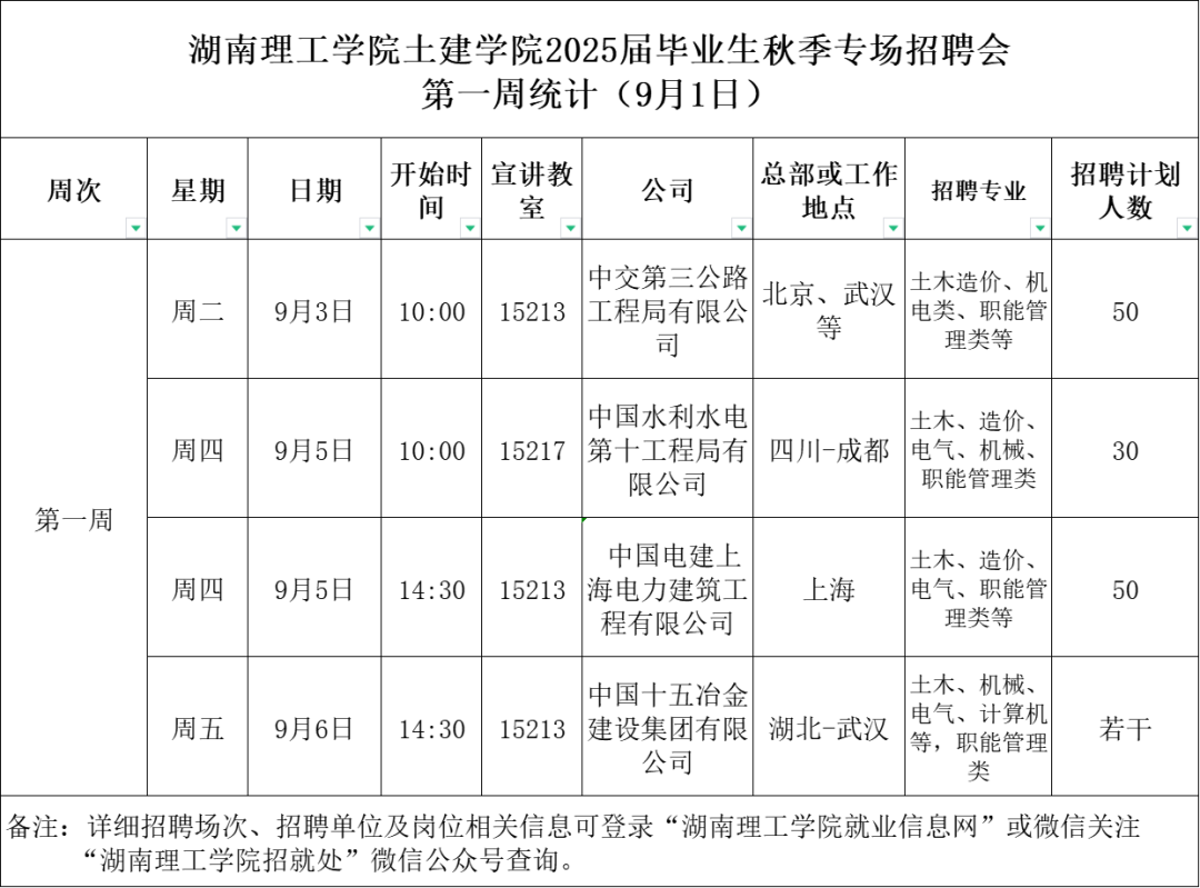 土建学院2025届毕业生秋季校园专场招聘会将于2024年9月3日正式启动大家都来看看,第一周有哪些土建类企业进校招聘吧!