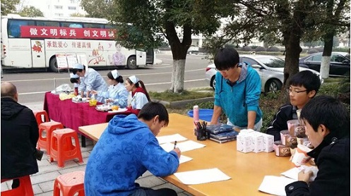 11月20日晚,我院于7T2 进行了无偿献血知识讲座。“无偿献血奉献奖”国家金奖获得者杨辉分享了他11年来无偿献血7万多毫升的经历,其事迹深深感动了在场同学。当晚还进行了无偿献血知识有奖竞答,气氛热烈。11月22日上午,我院爱心献血活动于16栋教学楼前进行,活动共持续了约9小时,累计71位同学献出了自己的温情与爱心。