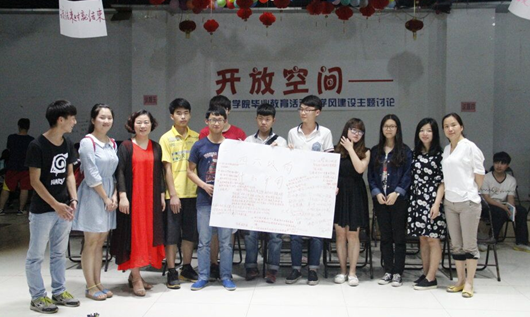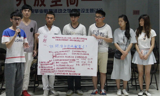 6月7日晚,我院2016年“开放空间——毕业教育活动之学风建设主题讨论”活动在学工部大学生活动中心举行。我院毕业生辅导员蔡奕担任主持引导,党总支副书记周畅、辅导员彭璐以及包括毕业生在内的各年级120多名同学围绕“大学是什么,大学生应该怎么做?”、“如何营建优良学风”、“考研有什么用”、“未来一段时间大学生的就业前景”、“什么是我想要的和需要的”等问题展开热烈讨论。