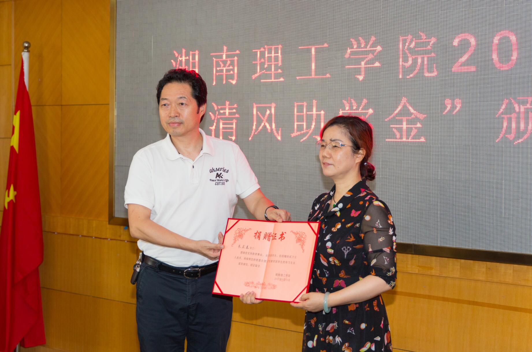 6月20日下午,2017年度“清风助学金”颁发仪式在1号办公楼319会议室举行,“清风助学金”捐赠者――湖南天元和项目管理有限公司总经理朱立春女士,岳阳市妇联党组书记、主席王亚丹、妇联副主席吴玉玺、妇联成员王凌、刘小平,岳阳市女企业家协会秘书长李白云、常务副会长田静以及致公党参与党员参加仪式。党委委员、组织部长刘创出席,党委学工部、我院相关负责人参加仪式。学工部负责人主持仪式。