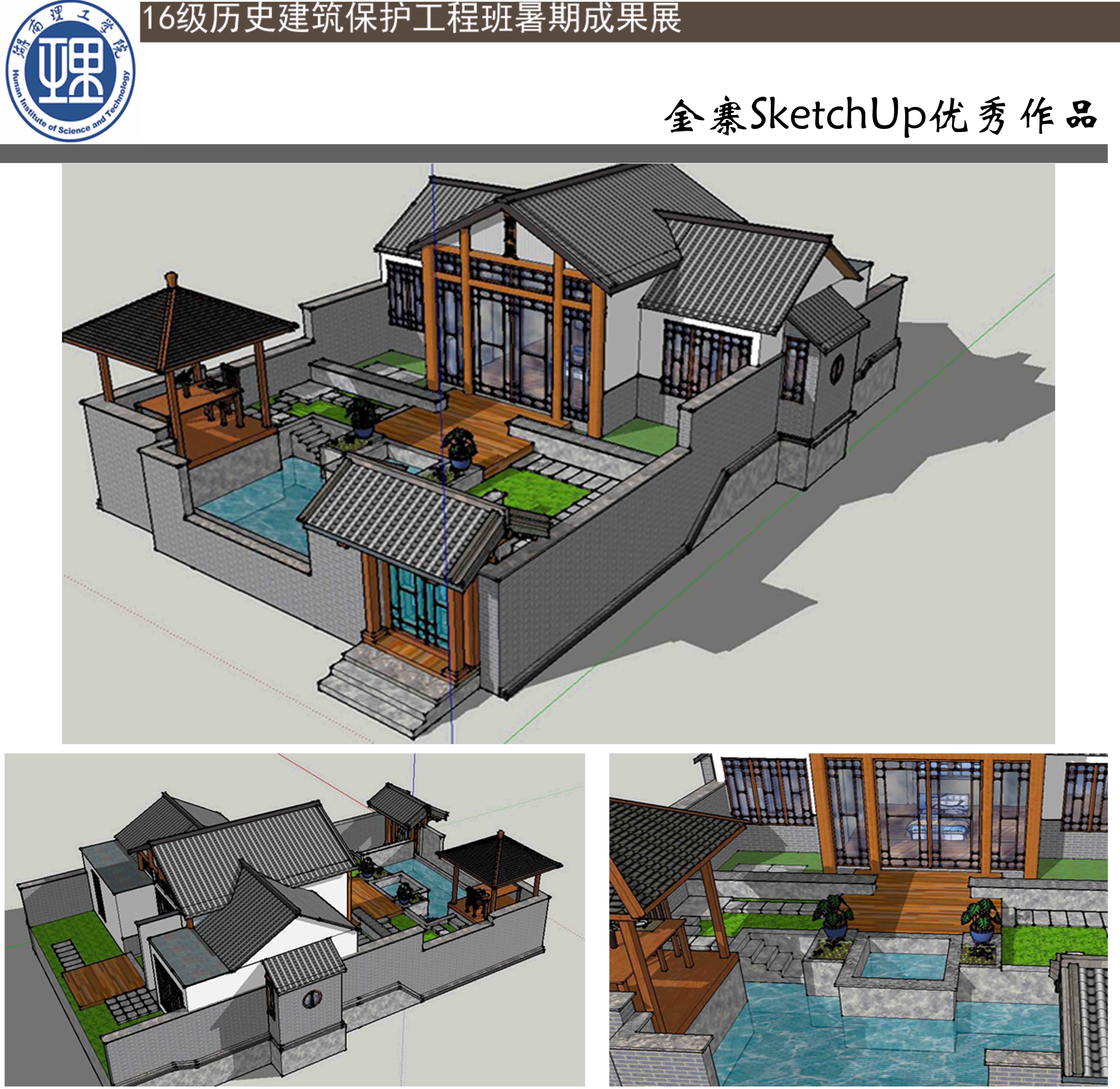9月中下旬,土建学院16级历史建筑保护工程专业“2016-2017学年暑期成果展”在16号逸夫实验楼前举行。本次展出的是16级历保班32名同学暑期建筑软件学习与实践考察成果,包括金寨AutoCAD抄图与SketchUp建模优秀作品以及上海国际建筑遗产保护与修复博览会心得分享。