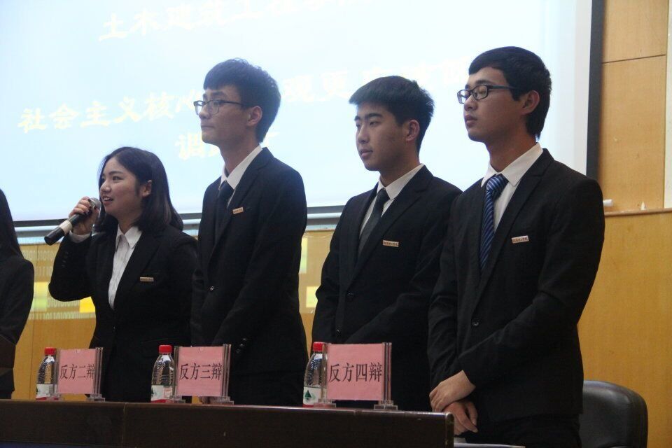 土建学院代表队作为反方与美术学院代表队就“社会主义核心价值观应该高调弘扬还是低调践行”这一辩题展开激烈辩论。比赛分为立论阶段、驳立论阶段、质辩环节、自由辩论、总结陈词以及颁奖六个环节。比赛中,双方就各自观点开篇立论,并结合具体事例进行论证。在随后的自由辩论环节中,双方队员引经据典,唇枪舌战,尽显风采,将整场比赛推向高潮,赢得观众阵阵喝彩。辩论赛结束后,雷蕾对本次正反方的表现进行了点评。经过现场评委评选,土建学院在此次决赛中惜败美术学院,夺得本次主题辩论赛的亚军,土建学院二辩欧阳书涵荣获最佳辩手。评委老师对各优秀团队及个人颁奖,并进行了合影留恋。(撰稿/杨欢龙 陈雅洁 谢甜 张贝多 摄影/陈贤)