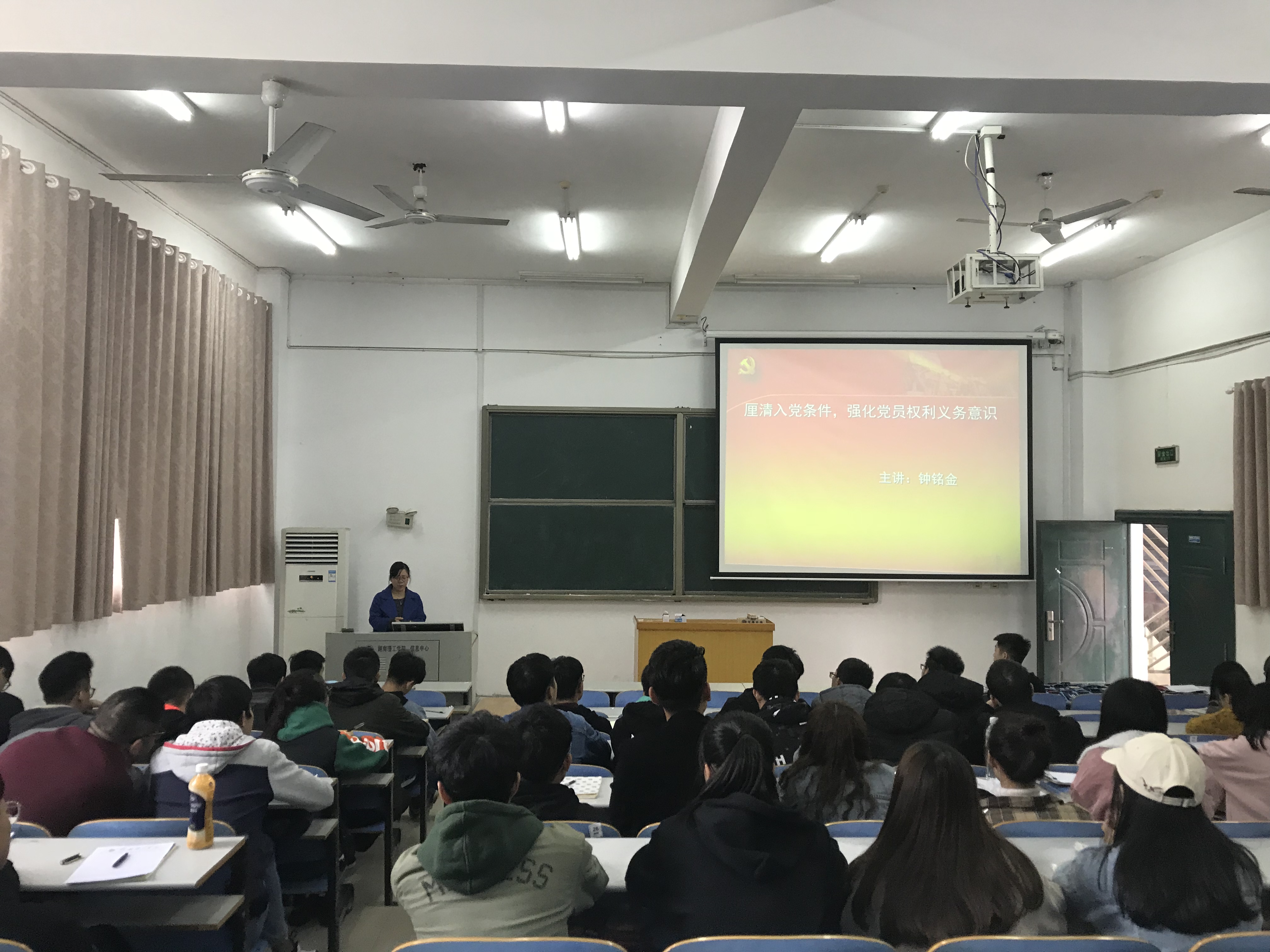 钟铭金以“厘清入党条件,强化党员权利义务意识”为主题,从“申请入党条件”、“党员的义务和权利”与“发展党员的考察程序”共三方面展开阐述,并强调了党员的八项义务、八项权利。她指出,有意入党的学生应纯洁入党动机,从“刻苦学习”、“为他人服务”以及“履行学生的责任和义务”三方面加强自身的党性修养。钟铭金为有意入党的学生明晰入党程序,并希望,有意入党的学生严格履行入党规则及程序,早日成为党员。
