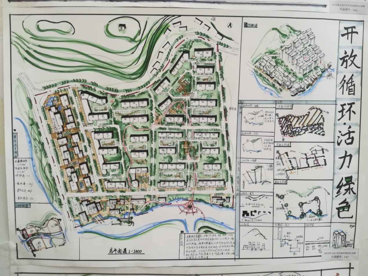 土建学院选手阳煜瑾的方案是根据分期建设的经济性和可行性,规划取地为西北角连续两块用地,此地块依山傍水,景观优越,以开放式街区为形式划分小地块,以景观渗透和景观廊道为条件建立宜人空间,正确布置商业、公共服务设施位置。选手王苗的方案注重绿色生态发展,打造“水木春城”:水—滨水空间、木—山体通廊、春—生机活力、城—有机生长,其功能主要以居住为主,配套相关服务设施,以“体验、空间;功能、有机;效率、活力”为三大策略进行方案设计,形态活泼,景观渗透性较好,重点突出了生态与可持续发展。
