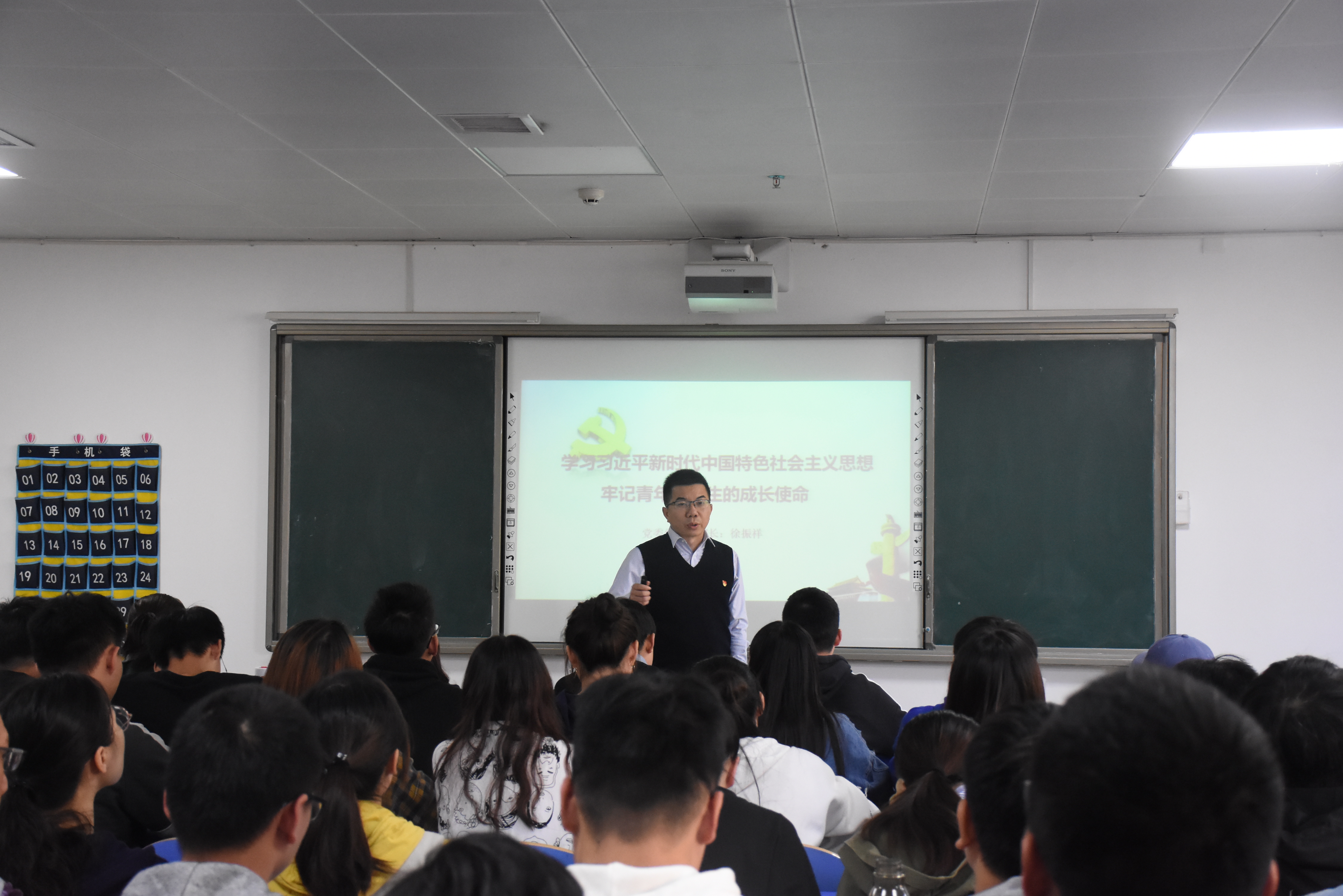 徐振祥以“学习习近平中国特色社会主义思想,牢记青年大学生的使命”为题,为大家讲授了一堂精彩而又生动的党课。他从时代课题视角、社会矛盾视角、精神实质视角和丰富内涵视角四个角度向同学们解读了习近平新时代中国特色社会主义思想。谈到党的十九大精神与大学生成长时,他从理想信念、道德和价值观念、学习和生活状况等方面分析了当代青年大学生存在的问题,并对同学们提出了建议和要求。他指出,大学生活是学生由象牙塔步入到社会的转型阶段,是锤炼专业技能、塑造价值观的黄金时期,希望青年大学生要认真学习和深刻领会习近平新时代中国特色社会主义思想,坚定理想信念,树立目标,刻苦学习,勇于实践,服务社会,努力争做有理想、有担当、有责任、有使命的新时代青年大学生。(撰稿/林晓)