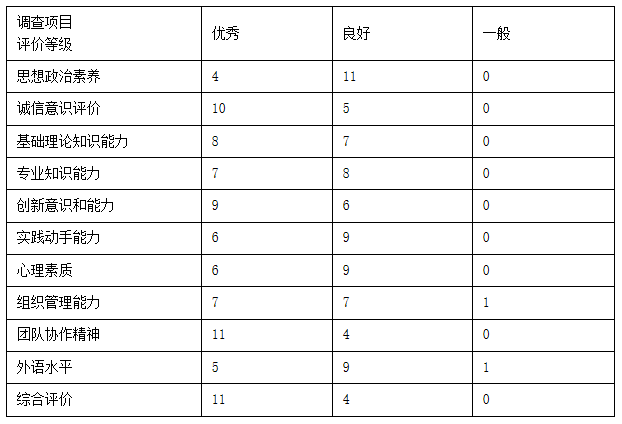 由上表可以看出用人单位对我院2020届毕业生在诚信意识、团队协作精神、综合评价方面的满意度较高,在组织管理能力、外语水平方面评价不足,在思想政治素养、实践动手能力、心理素质等方面认为有待提高。