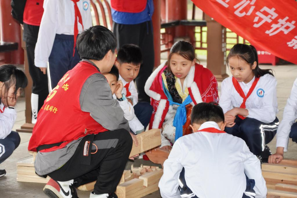 诵读《岳阳楼记》,观赏“五朝楼观”青铜模型建筑群,学习“三层、四柱、飞檐、纯木”这些古建筑名词,甚至在大哥哥的帮助下自己动手搭建岳阳楼模型,“这可比在教室里看看照片有意思多了,希望长大以后我也能和大哥哥他们一样,成为古建筑保护团队的一员!”参加此次古建筑保护研学活动的小朋友们兴奋地说道。