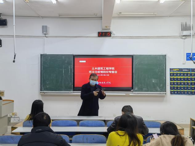 3月23日晚9点,土建学院于15116教室召开班主任疫情防控专题会。会议由土建学院党委副书记钟铭金主持,土建学院党委书记杨恒山、院长童小龙及全体班主任参加此次会议。