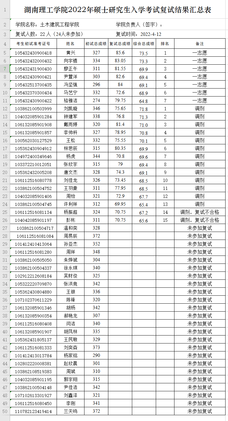 湖南理工学院2022年硕士研究生入学考试复试结果汇总表